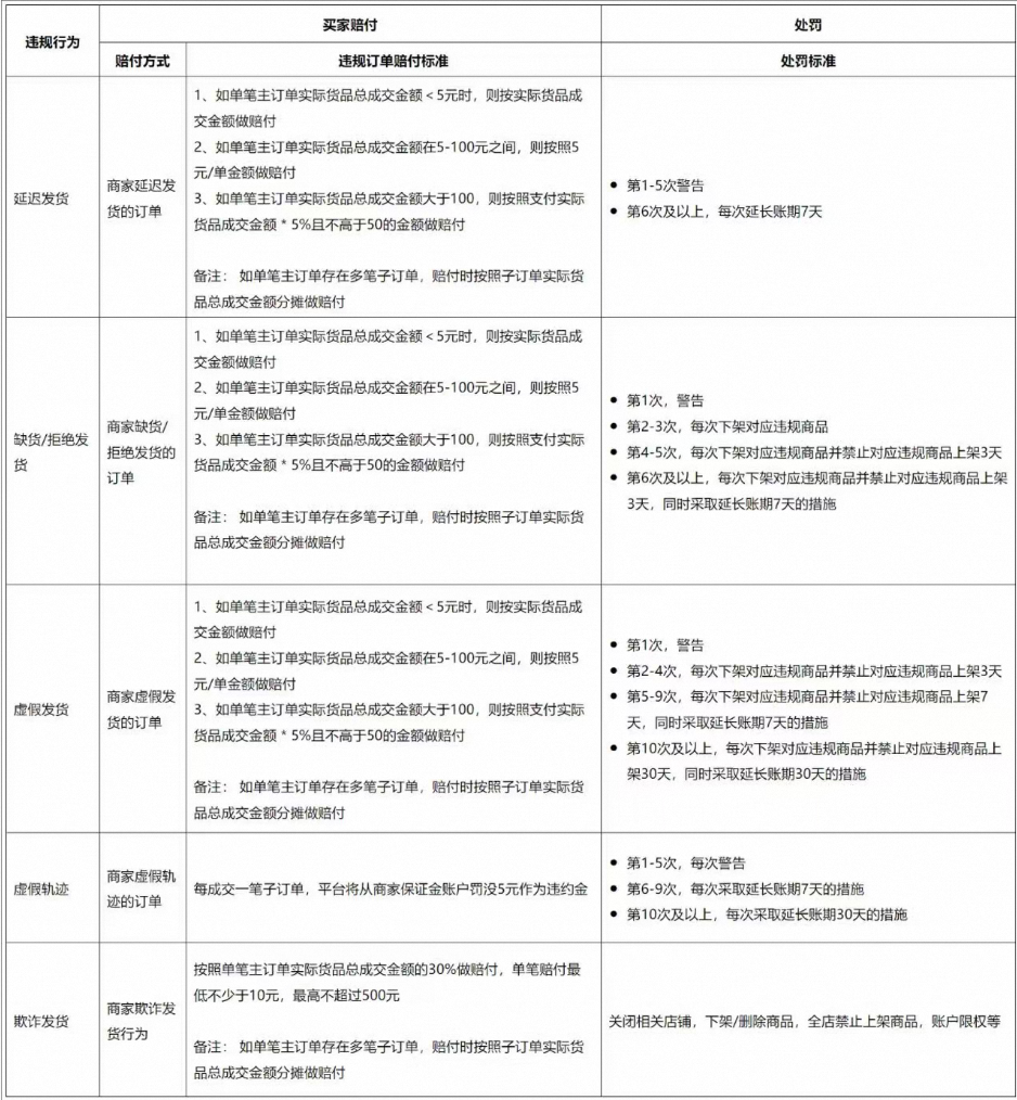 违规判定:平台系统实时判定,每识别出一个发货超时订单,则会被记录延迟发货订单。