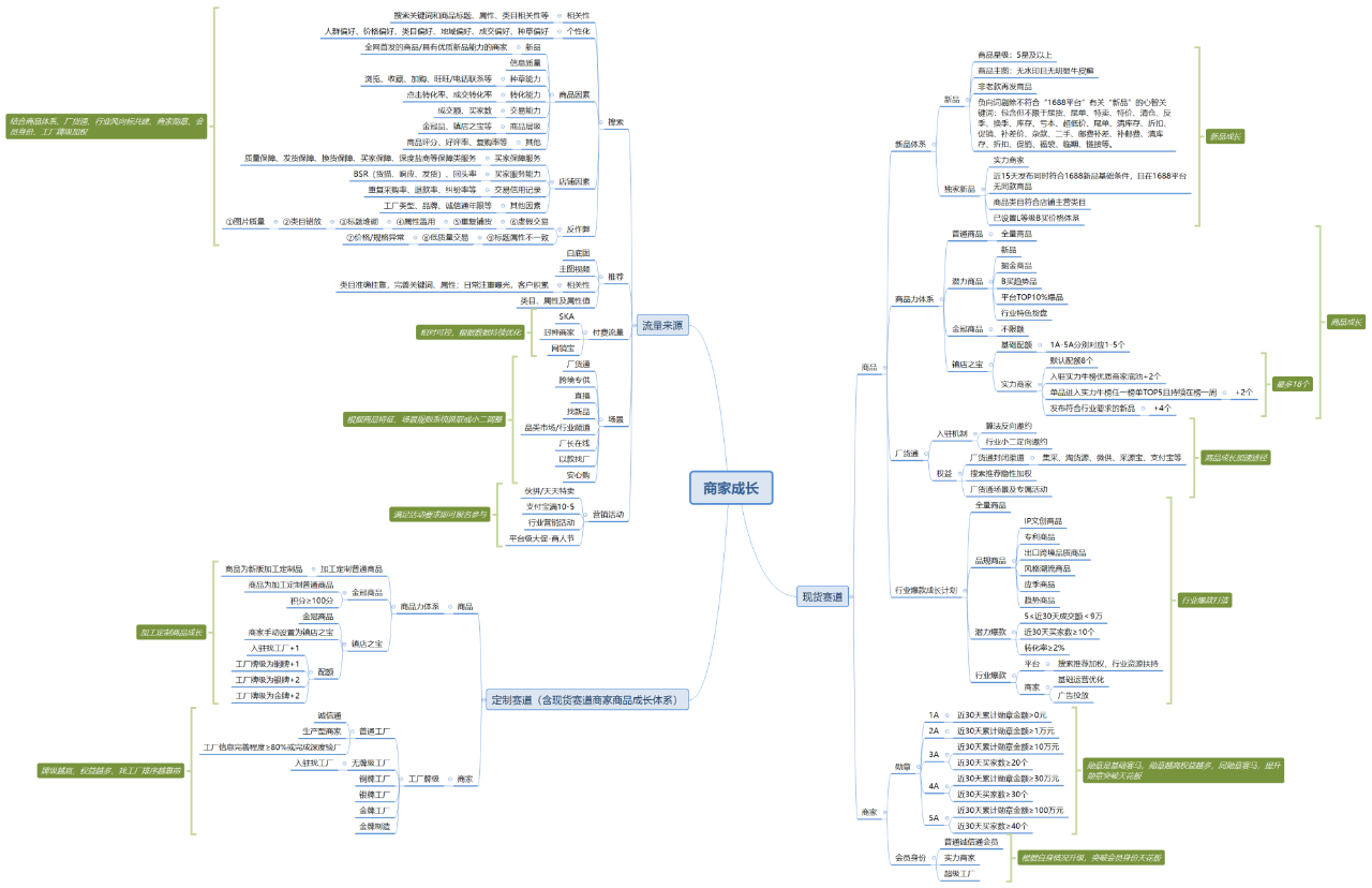 在1688做得不错的商家,通常能够持续上新品,产品具有竞争力的商家。有价格力/趋势力/特色货盘等优势,将自身优质好品动销破零打造成平台热销金冠品。优化商品关键信息,争取搜索排名上首页及各类推荐位。做好找工厂金牌制造榜单,严选商品推荐,分销商品,伙拼等场景,将商品通向不同场景流量池。通过1688平台商人节等营销活动拉起营销节奏,积累店铺及商品数据优势。进入实力商家/超级工厂门槛,逐步向平台TOP靠近。通过数字营销放大流量,对标行业头部商家,目标成为SKA级别的店铺。做好服务提升响应率及履约率,买家管理精细化,客户维护和复购挖掘到位。层级做到行业TOP,保持交易勋章及L等级。持续关注平台动态,紧跟新政策新规则。