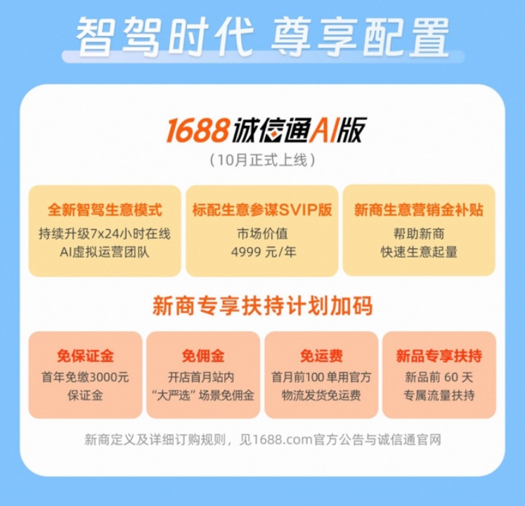 针对新入驻1688并开通诚信通AI版的商家,平台将同步上线“新商扶持计划”:首年免缴保证金,首月在站内“大严选”场景免佣金,首月前100单使用官方物流发货可享免运费,且入驻后60天内发布新品还可获得专属流量扶持。